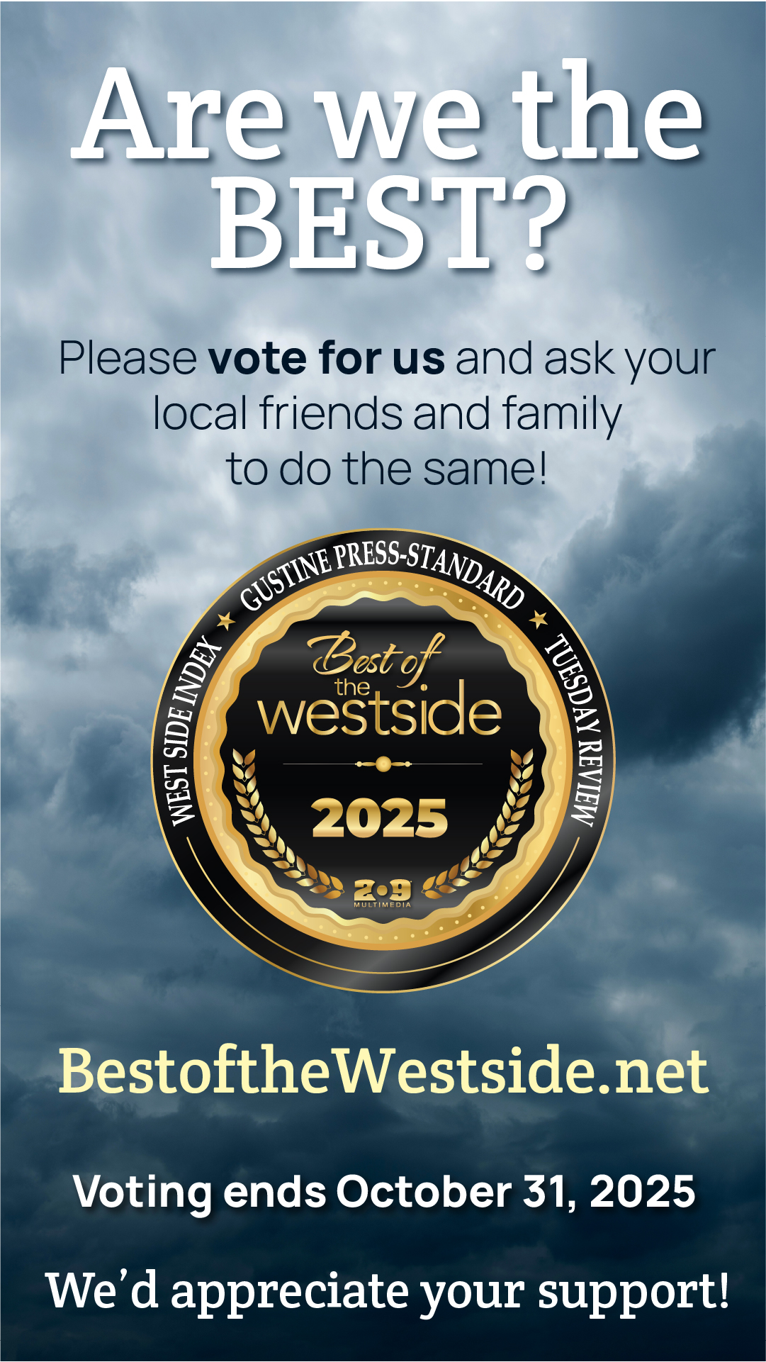 Note: 209 Multimedia owns all copyright, including Best of the West Side images and other intellectual property rights in materials that are created by 209 Multimedia for our advertisers. Reproduction of those materials without our expressed consent is a violation of the copyright law. All Best of the West Side images must include the “Vote for Us” or “Winner” verbiage; use of the blank contest logo is prohibited. If you have any questions, please contact our promotions director at promotions@209multimedia.com or (209) 249-3531.
